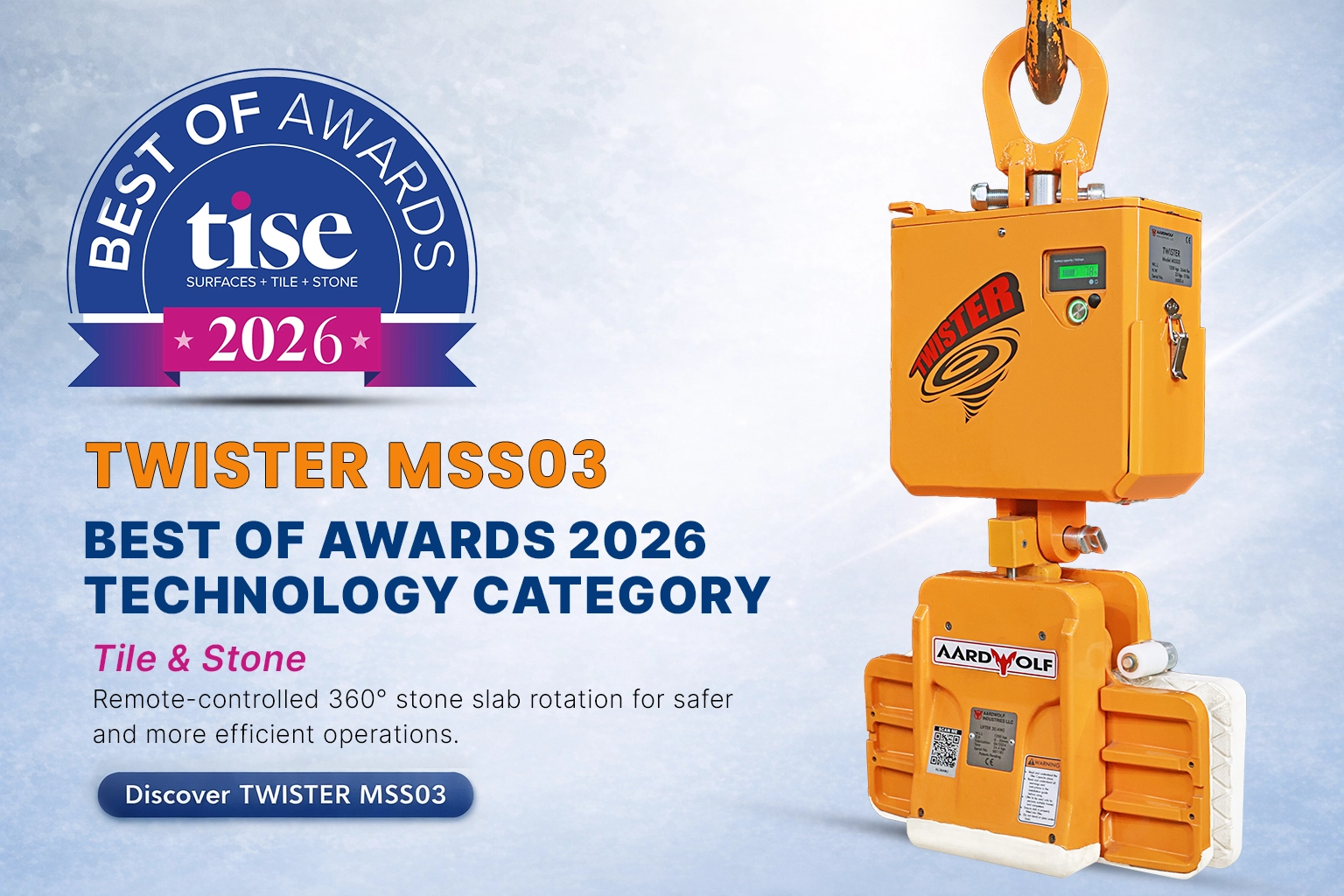 Organized annually by TISE, the Best of Awards honor products and technology solutions that make meaningful contributions to advancing industry operating standards, with a focus on technological innovation, job-site safety, operational efficiency, and real-world applicability. At the 2026 awards, Aardwolf was recognized for the Twister MSS03, a remote-controlled stone slab rotating device that reflects the company’s ongoing focus on developing safer and more efficient material handling solutions for practical working environments.
